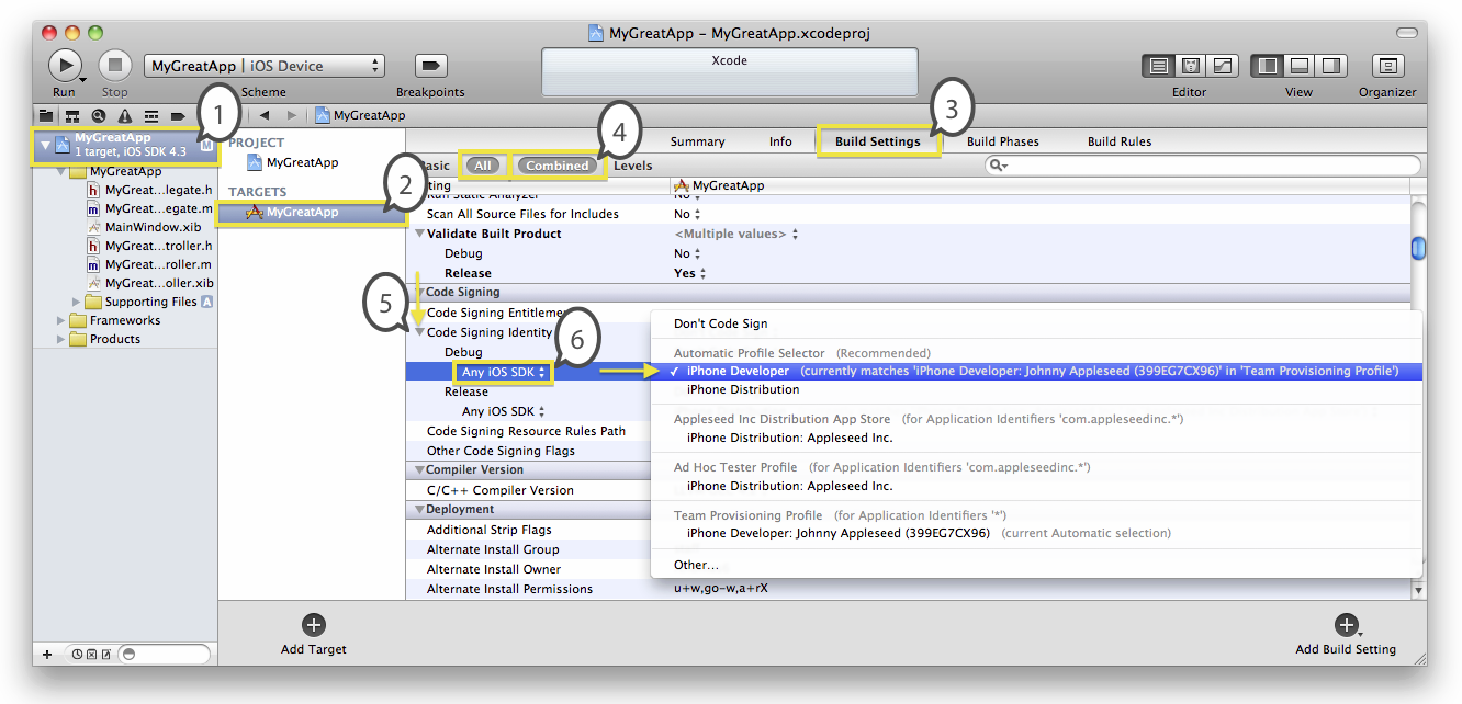 16,395 PointsI just had the "Too few items in Teams" as well. The solution was to go to the Provisioning Portal and create a new profile specific for my domain name, in my case "com.rocking-mm.*" After that I right-clicked on my iPhone listed in Organizer, unplugged it, then plugged it back in. It then asked me for my Apple ID and password again, and it downloaded the updated provisioning profile -- you may need to go to Library > Provisioning Profiles, and click the refresh button to have it try to re-download the profiles.