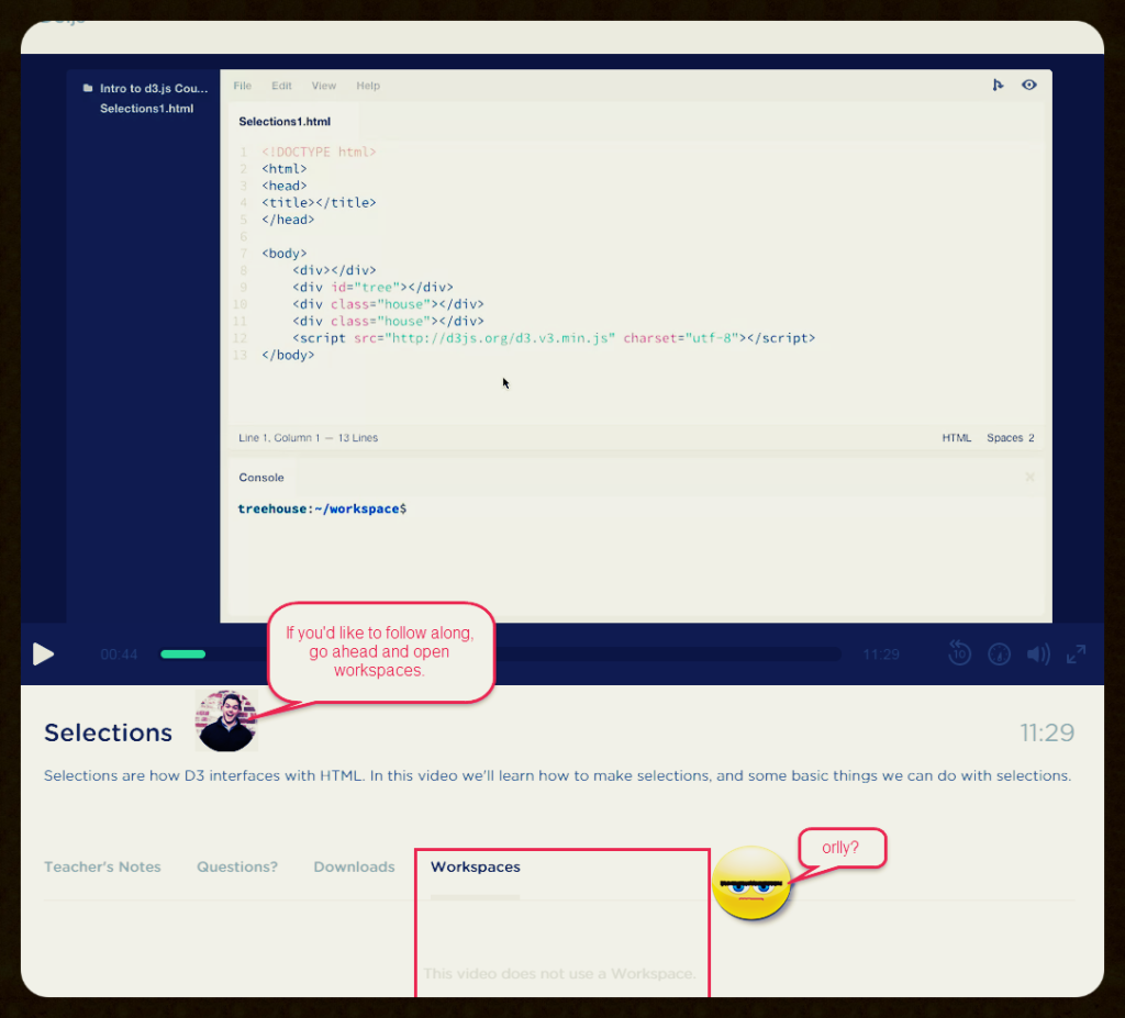 14,636 PointsHuston, we have a problem. D3.js V2: Selections. Workspace broken? or not "active" yet?