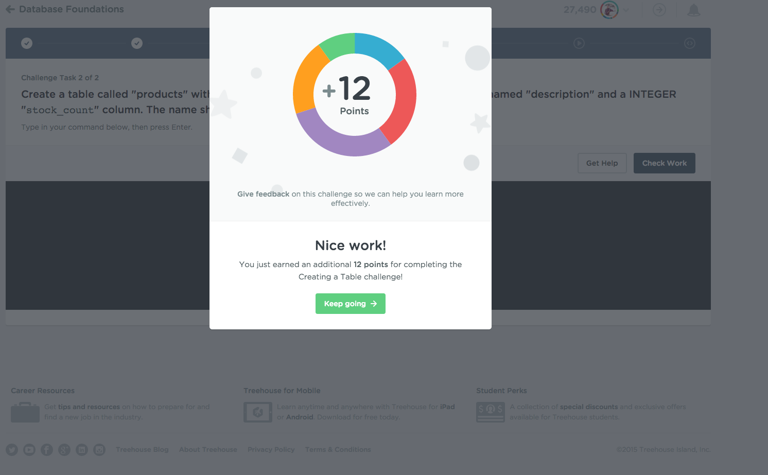 Treehouse Moderator 37,862 PointsJust got the pop-up in the database foundations course, Creating Tables and Manipulating Data with SQL badge, creating a table CC: