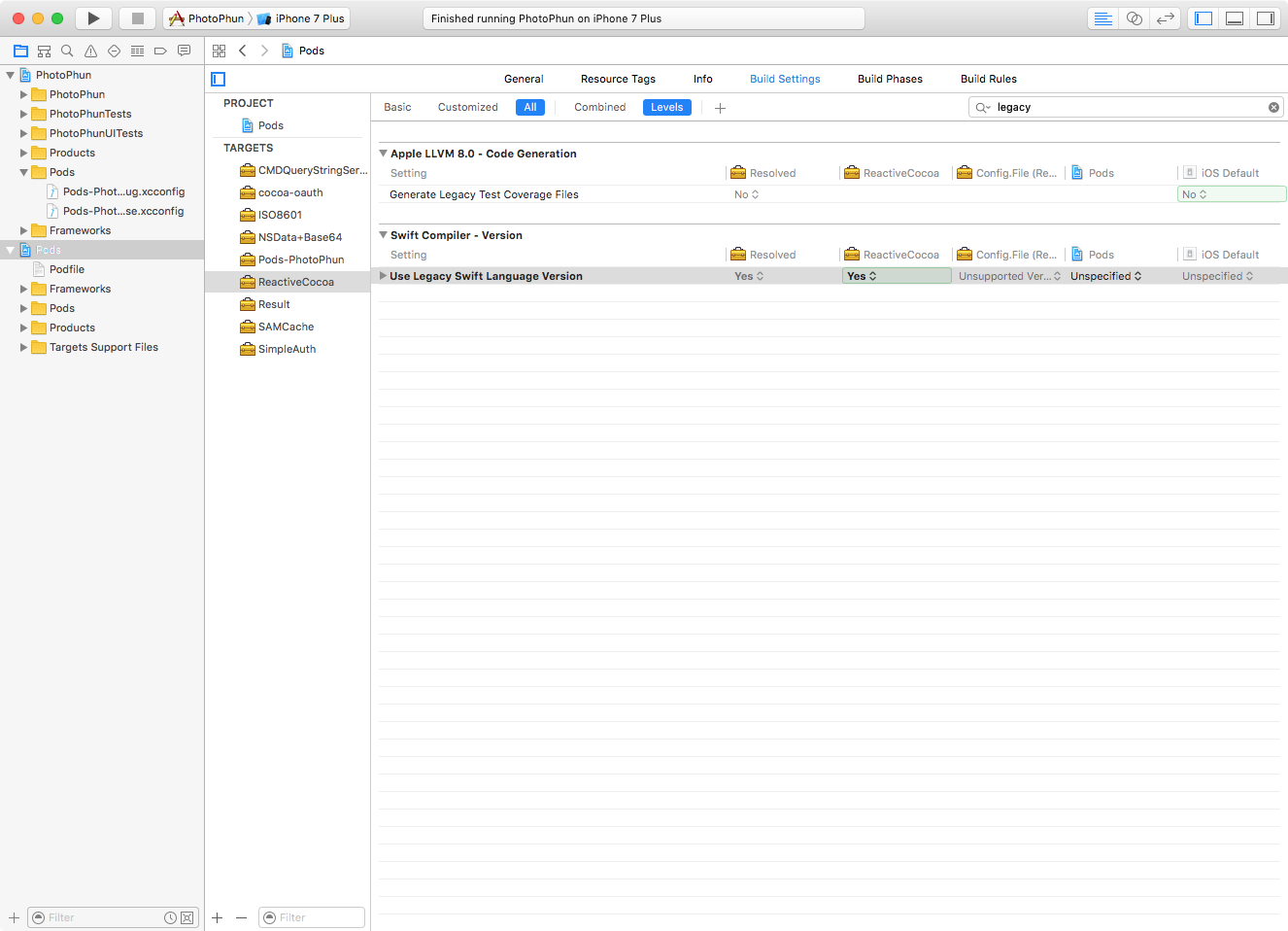 So Xcode 8 forces you to convert any Swift code you might have in your project — including any code inside of your project’s dependencies — to either Swift 2.3 or Swift 3.0. Complying with Xcode’s demands seems to have no adverse effects for most of SimpleAuth’s dependencies with the exception of ReactiveCocoa; ReactiveCocoa throws like 17 errors upon conversion. The only way around this, then, is to set the Use Legacy Swift Language Version property of each project to YES (the setting can be found in each project’s Build Settings). The easiest method of doing this would be to add the following to the bottom of your Podfile: