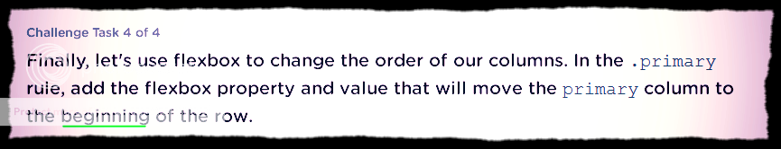 5,909 PointsWhats wrong with My Answer. I set .primary { order: 1; } and its not working