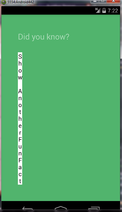 355 PointsWhen I hit the Show Another Fun Fact button, i get a screen with a text in vertical saying "Show AnotherFunFact"